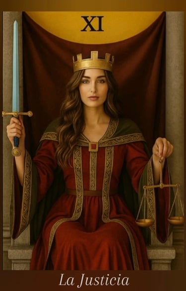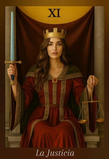 La Justicia representa equilibrio, orden y consecuencias justas. Este arcano aparece para recordarte que todo lo que sucede ahora responde a un alineamiento natural entre acción y resultado. Es un momento para actuar con ética, buscar transparencia, resolver asuntos legales o emocionales pendientes y recuperar el equilibrio interior. También indica claridad mental y la capacidad de ver las cosas tal y como son.