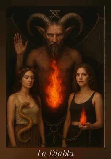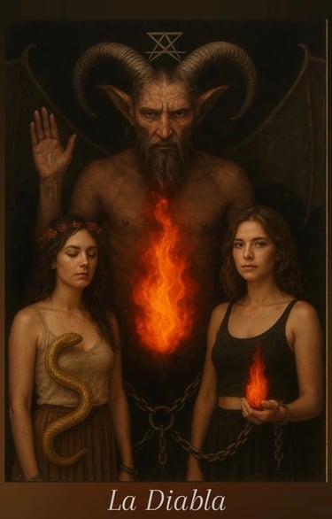 El Diablo simboliza deseos intensos, tentaciones y la oportunidad de romper cadenas. Este arcano ilumina lo que te ata: miedos, hábitos, dependencias o creencias limitantes. No aparece para asustarte, sino para empoderarte. Te invita a reconocer tu sombra, integrarla y liberarte de aquello que te mantiene estancado. De esta energía surge una fuerza interna inmensa cuando te atreves a mirar de frente lo que te limita.